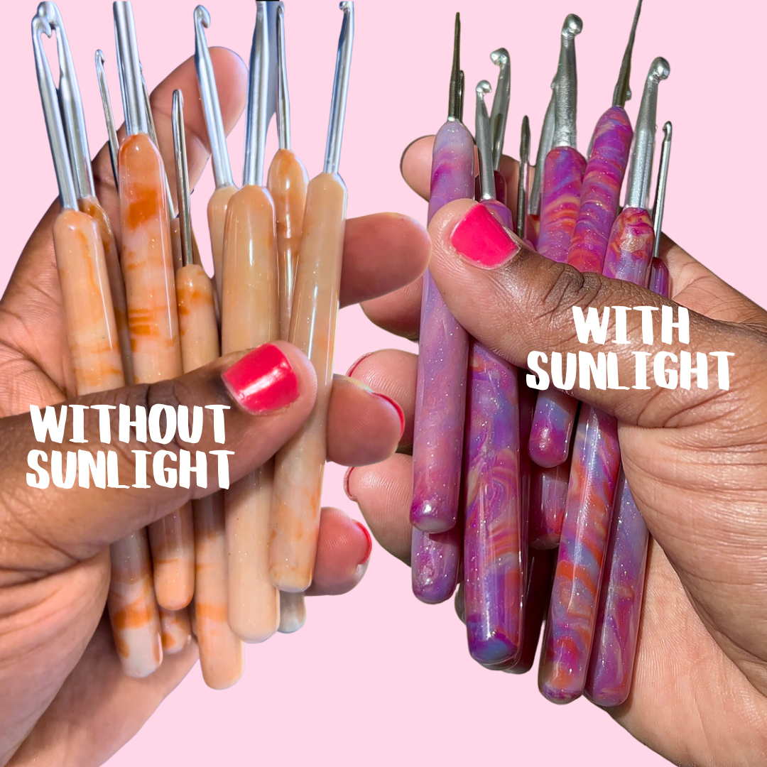 Hi crafters! I’ve designed some color changing crochet hooks for you. The hook handles are hand-rolled, made from polymer clay and coated with resin. Colors and patterns will vary.